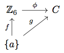 We need there to be only one such diagram for any two objects of our category: that, given the values of \(f(a)\) and \(g(a)\), there exists a unique homomorphism \(\phi\) making the diagram commute. Is this the case? Yes! The key is that the definition of \(\phi\) is forced by the commutativity of the diagram. We need \(\phi(f(a))=g(a)\). However, since both \(\mathbb{Z}_6 \) and \(C\) are candidates for \(B(1,6)\), we know that we can write any element in either as a power of \(f(a)\) or \(g(a)\). Say \(f(a)=1\) and \(g(a)=1\); we know that \(f(1)=1\) from the commutativity of the diagram. If we want to know where — say — \(3\) goes, we just write \(3=1+1+1\). Then \(\phi(3)=\phi(1+1+1)=\phi(1)+\phi(1)+\phi(1)=g(a)+g(a)+g(a)\). \(\phi\) is indeed a homomorphism, and there was no other possible way of defining it.