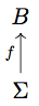 Each object in \( \mathscr{B}_{m,n} \) is a candidate for the Burnside group \( B(m,n) \). The group itself is \( B \); we also have a set-function \( f \) identifying each “letter” in the “alphabet” \( \Sigma \) with an element of \( B \). We also have that every element of \( B \) raised to the \(n\)th power is the identity. Notice that the diagram itself is not a category; even though it has objects and morphisms, there are no identity morphisms and the objects are respectively a set and a group! We don’t need it to be itself a category, though.