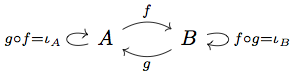 This is exactly the same as the isomorphisms diagram in the last section, but with the objects and morphisms renamed for the sake of generality. Notice that both objects have identity morphisms and every possible composition of morphisms yields a morphism that’s already there.