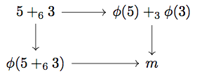 We have two ways of getting to an element \( m \) of \( \mathbb{Z}_3 \), depending on whether we start with the operation or with the set-function. Well-definedness means we should be able to follow the arrows in any way in the above diagram and get the same value for \(m\) — the diagram should commute. In other words, we should have \(\phi(2+3)=\phi(2)+\phi(3)\).