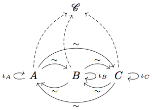 The above is a category with three initial objects, \( A \), \( B \) and \( C \). The \( \mathscr{C} \) is just the rest of the category. For every ordered pair \( A \), \( B \) and \( C \), we have only one arrow with that domain and codomain. Then we can compose — say — the unique morphisms from \( A \) to \( B \) and \( B \) to \( A \); if they compose to form \( \iota_A \), we have that \( A \) and \( B \) are isomorphic. Is this the case? Yes, because \( A \) is only allowed to have one arrow to itself as an initial object, and it has to be \( \iota_A \)! By the way, we can draw a little \(\sim\) above an arrow to say that it represents an isomorphism. Category theory proofs usually work this way — we draw some objects and arrows and notice that something is forced by definitions.