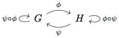 By applying \( \phi \) to \( G \), we preserve structure but often lose detail. Not always, though. It is possible that there is also a homomorphism \( \psi \) from \( H \) to \( G \), and that we can follow the two homomorphisms in sequence and end up in the same place; that is, \( \psi(\pi(G)) = G \). Have another diagram: